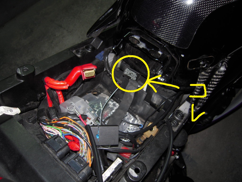 シートの下というか、タンクの下というか、バッテリーの前というか・・。
