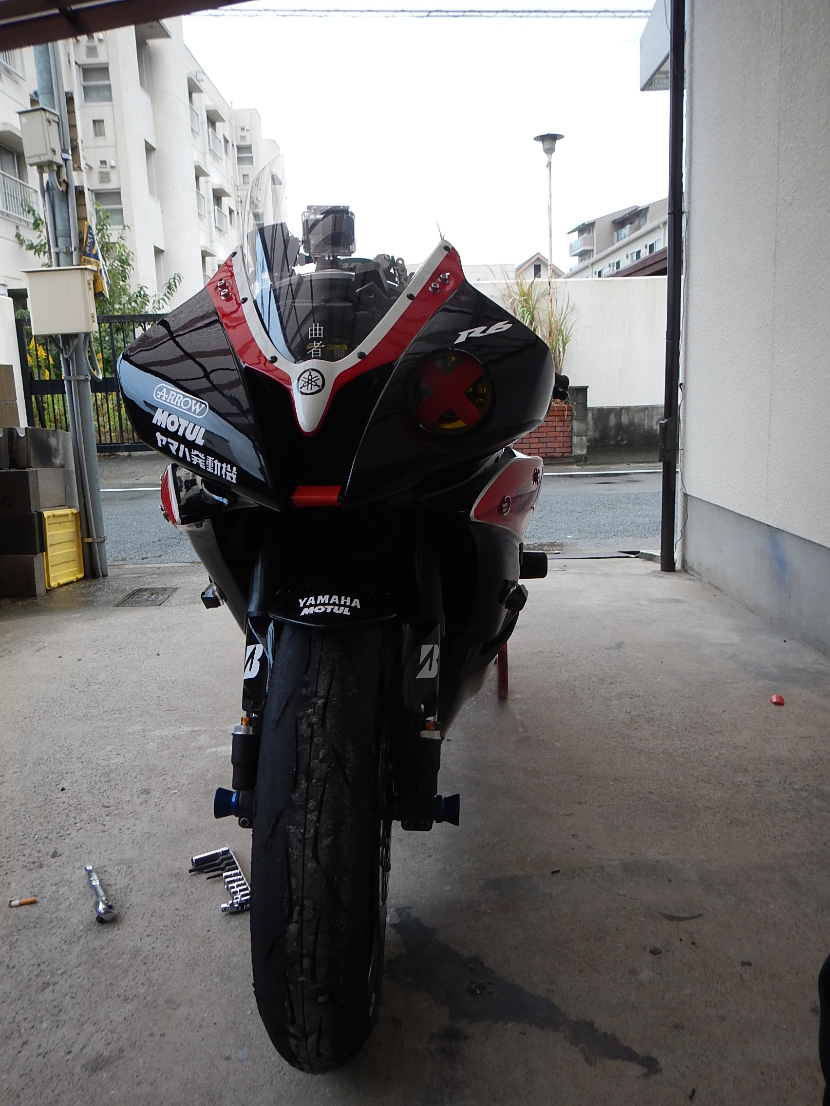 ボルト類をまし締めし、ヘッドライトにもガムテを貼り終了です。