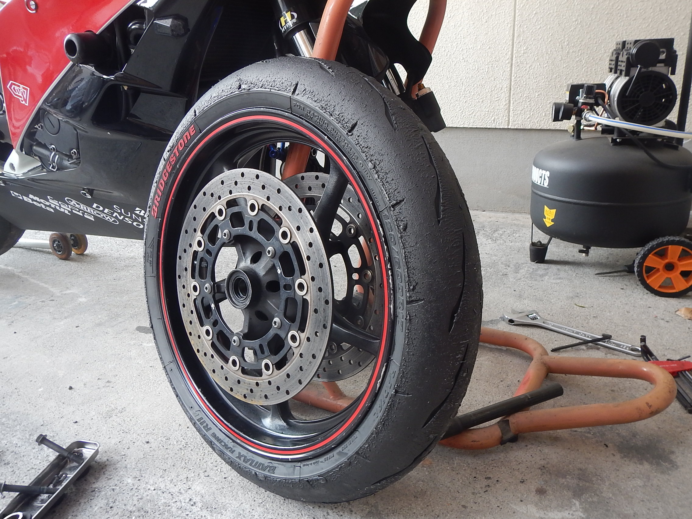 タイヤレバー突っ込んでグリグリ。膝でガシガシ押してようやく外せました(汗だく