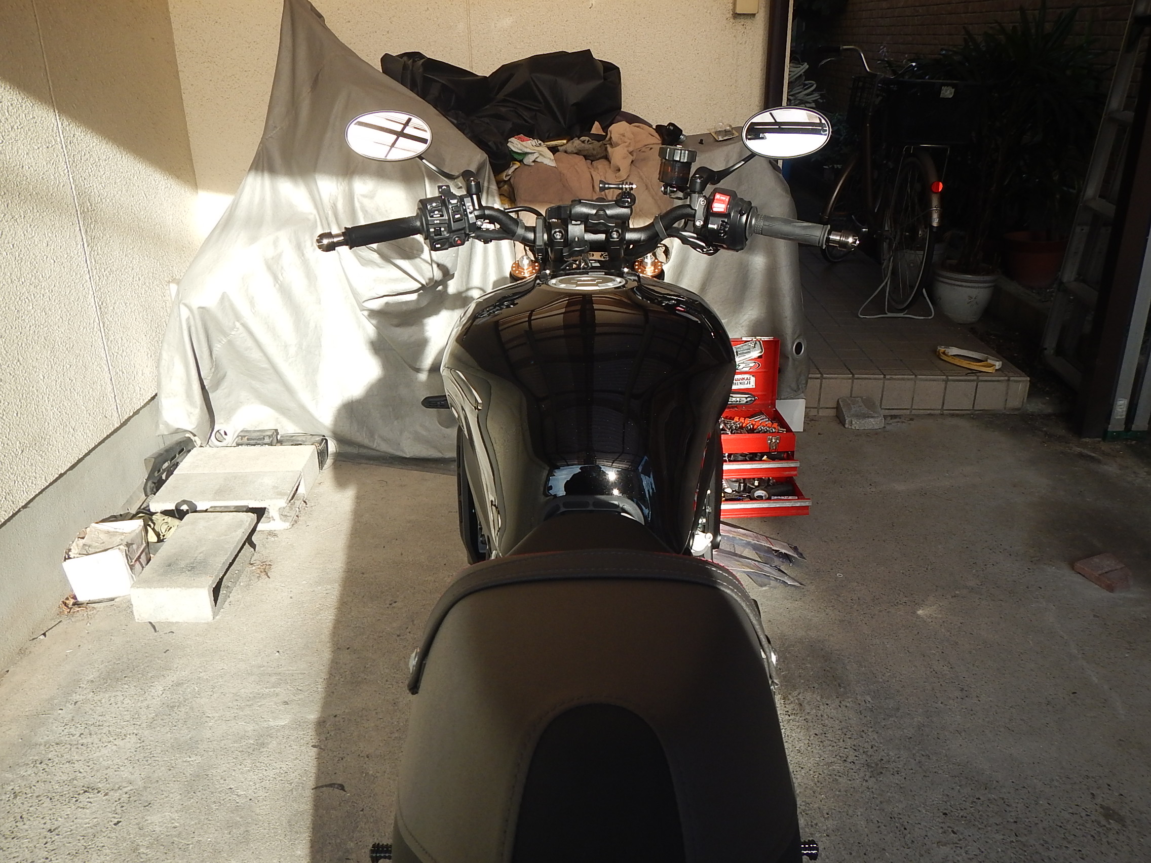 純正のバーエンドミラーはスタイリッシュでなかなかカッコイイんだけど、