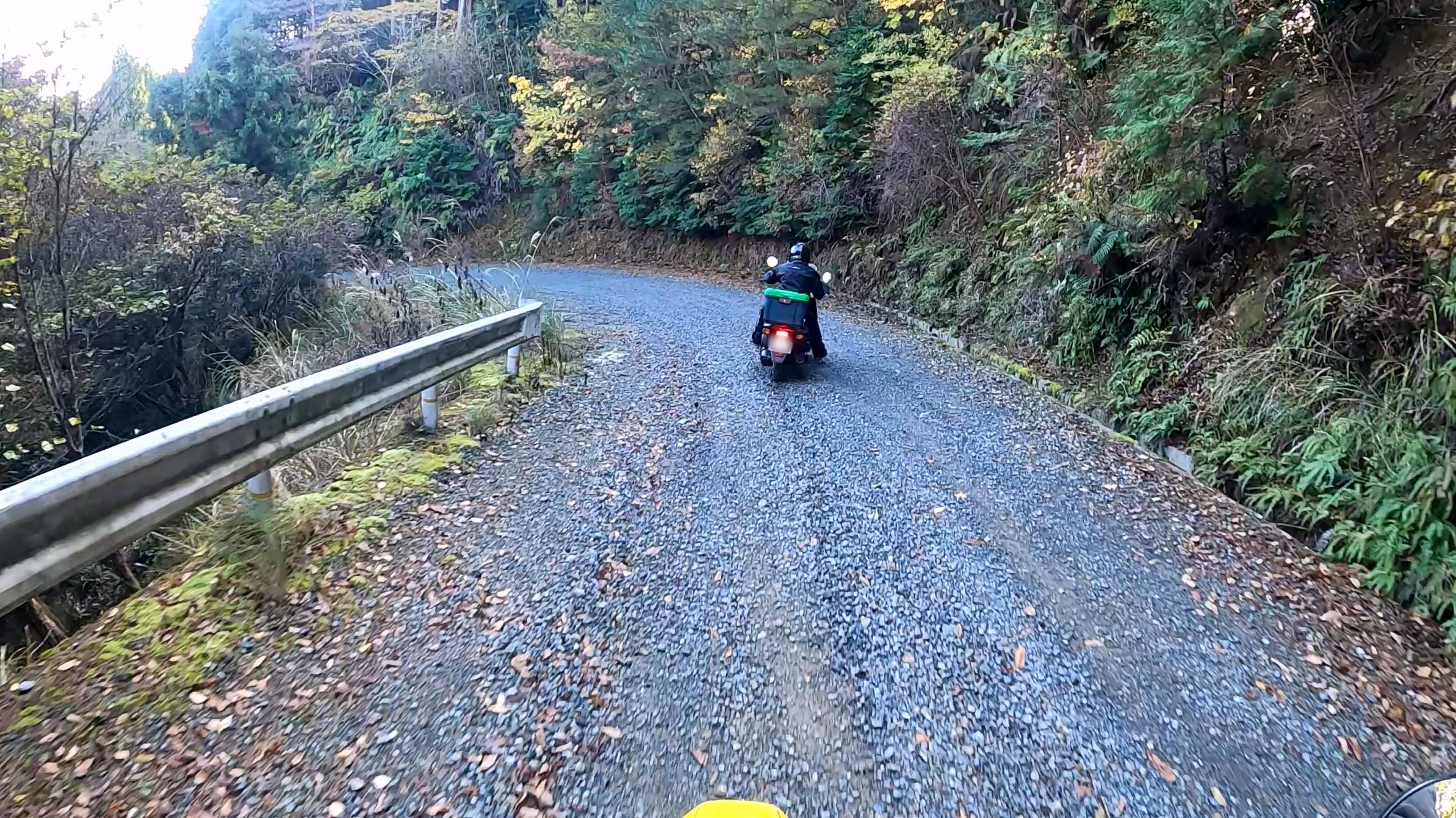 明け方前に降ってた雨の影響で落ち葉が濡れて飛ばすと滑りそう。